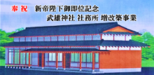 当神社では、新帝陛下御即位の佳節を記念し、奉祝記念事業として社務所増改築を計画いたしました。 参拝者の利便性の向上をはかるとともに、御神威の尊厳保持・御神徳の更なる発揚をはかりたく念願いたしております。 つきましては、右 …